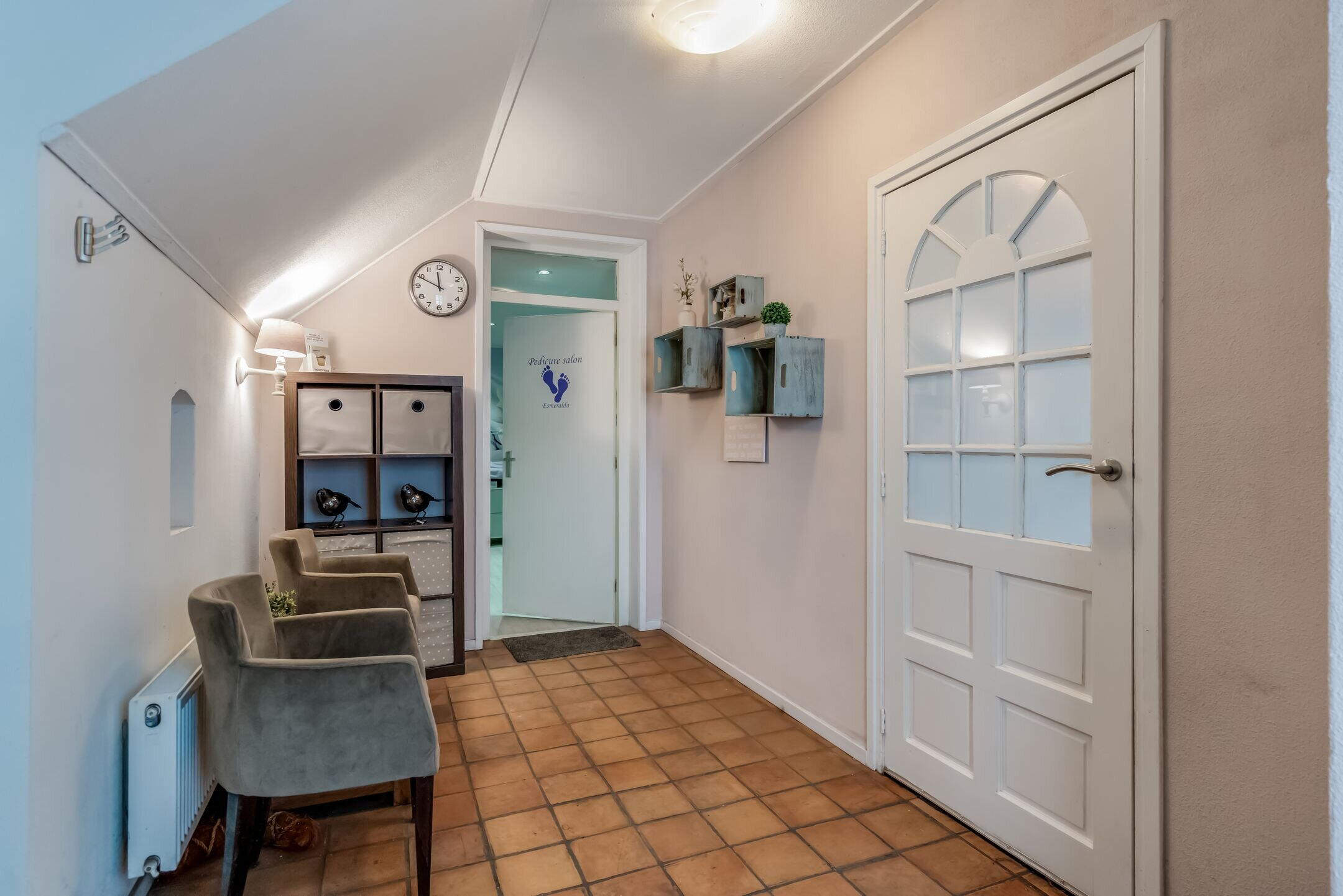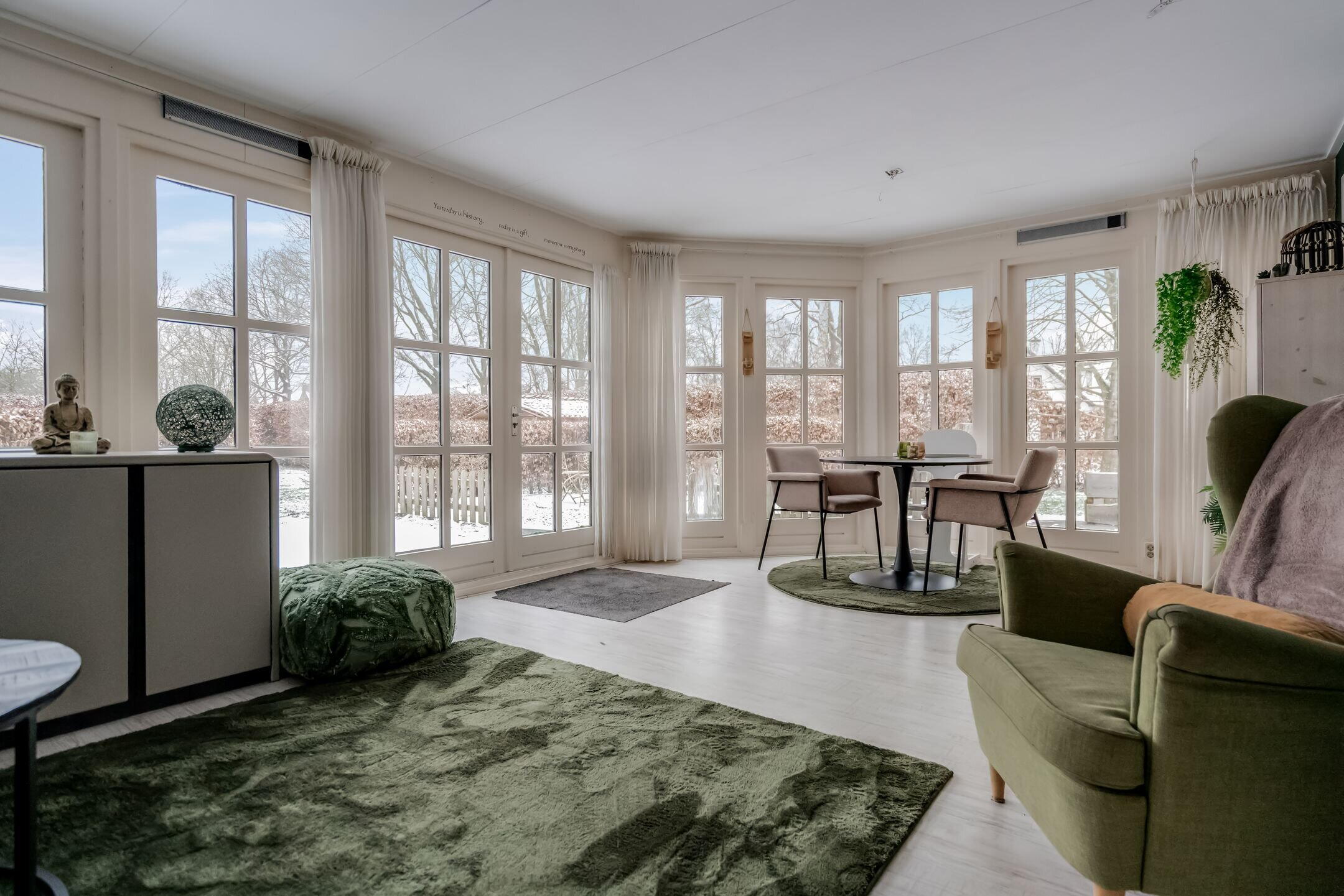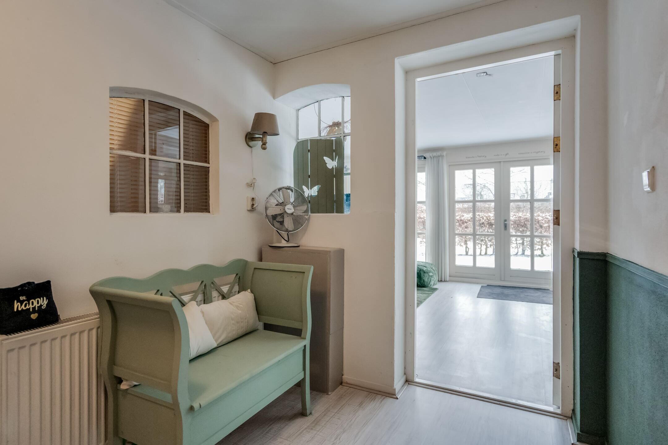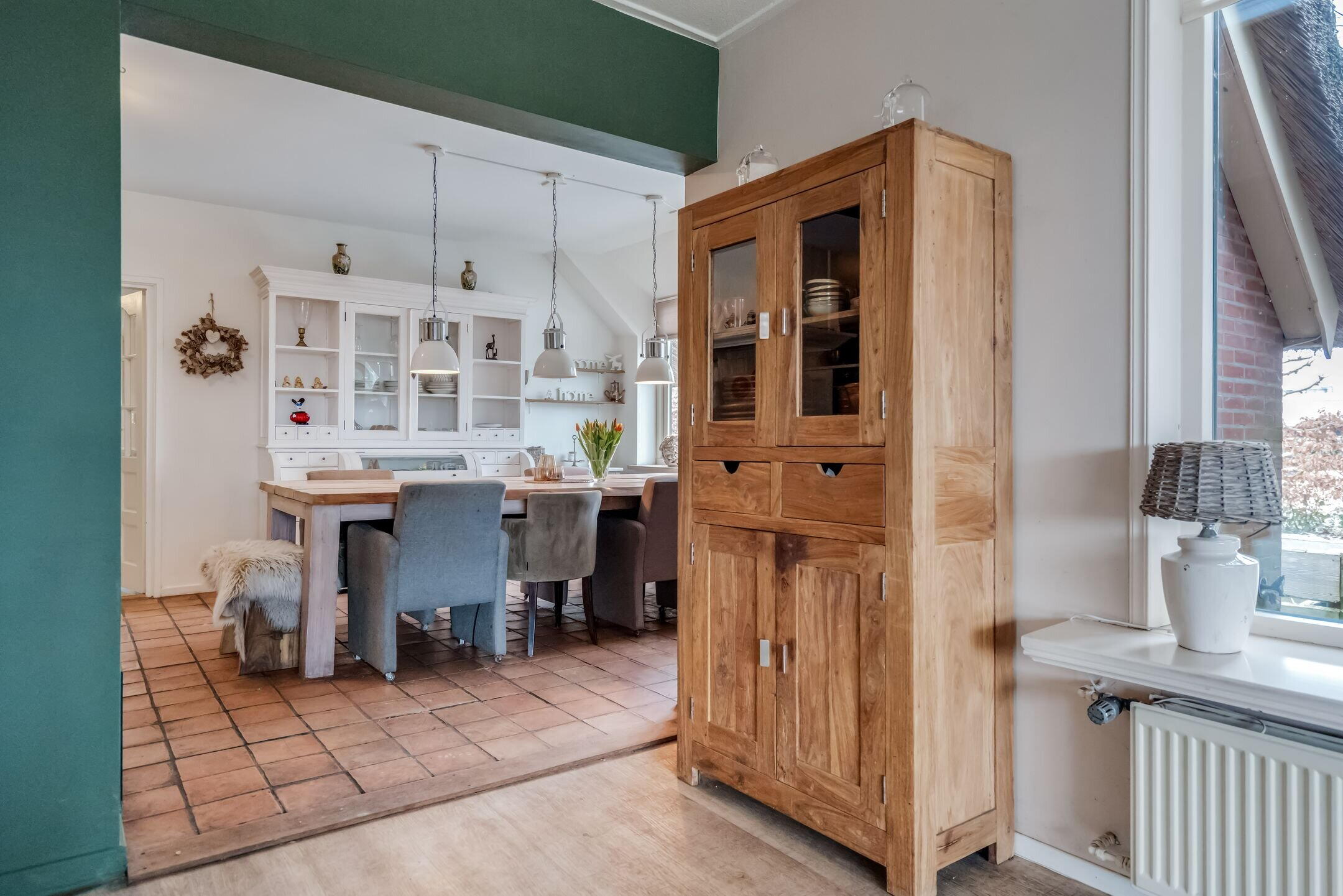 Hal/entree met toegang tot de praktijkruimte, de schuurruimte en de gezellige, ruime woonkeuken, die overgaat in de L-vormige woonkamer met houtkachel. Samen vormen deze ruimtes een oppervlakte van circa 68 m². Via tuindeuren bereikt u de fraaie veranda met uitzicht over de grote, besloten tuin.