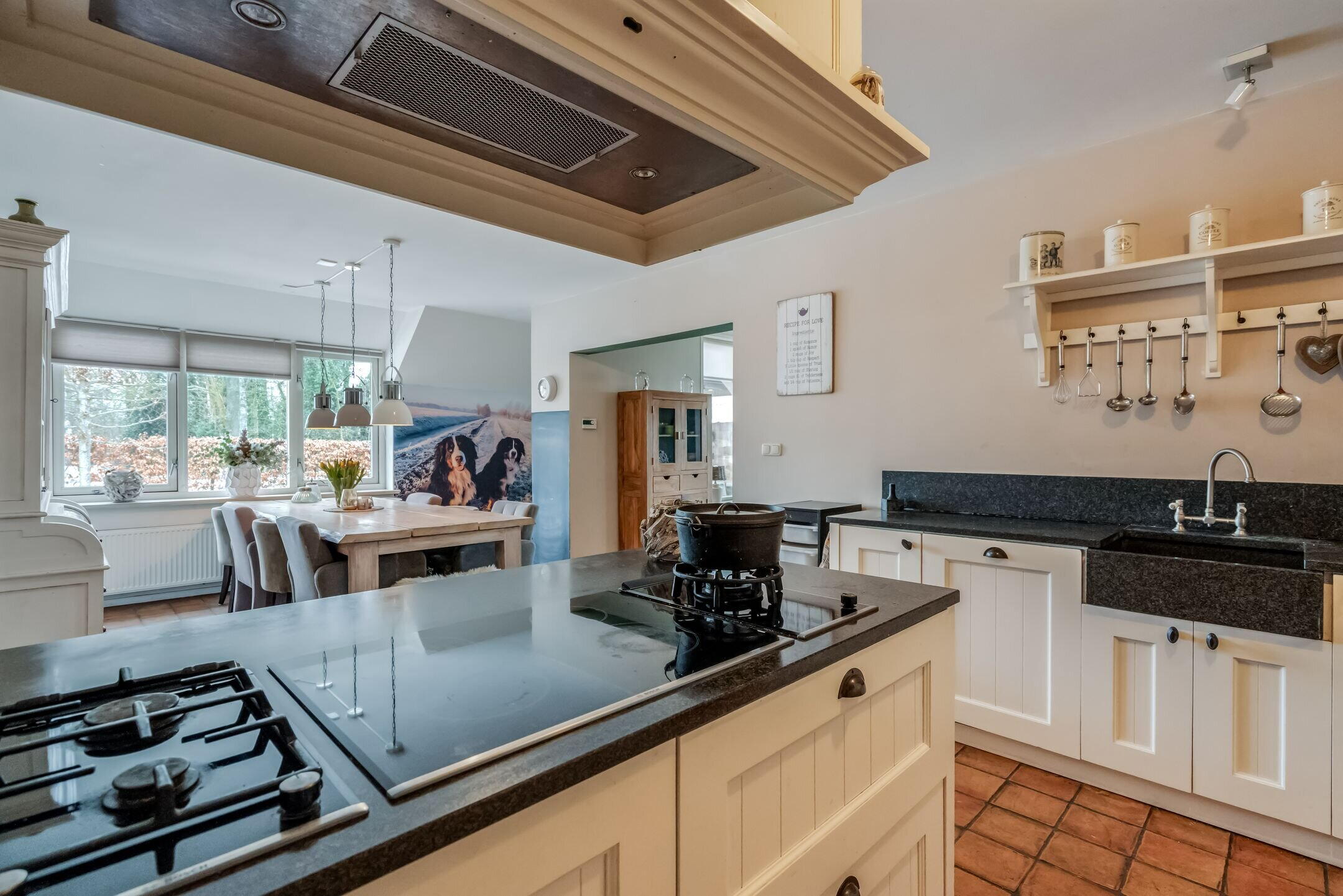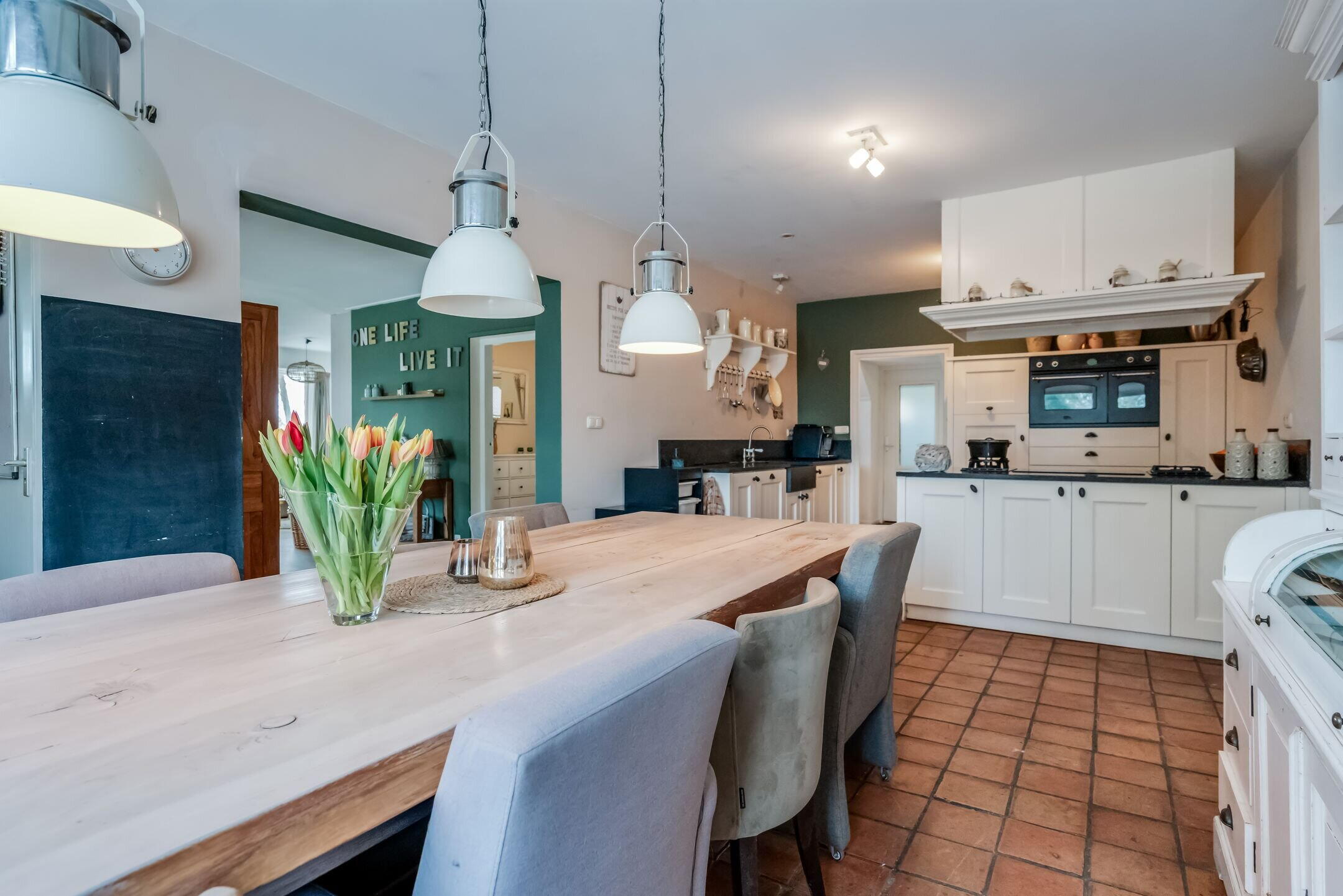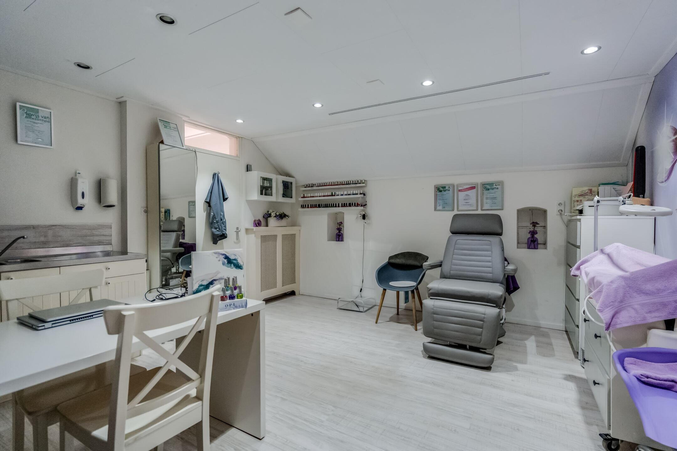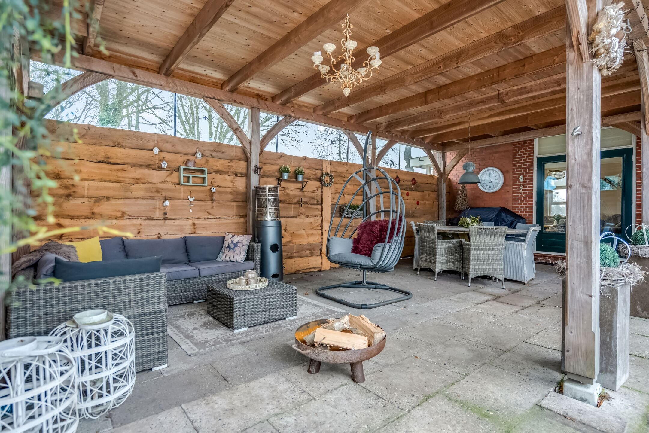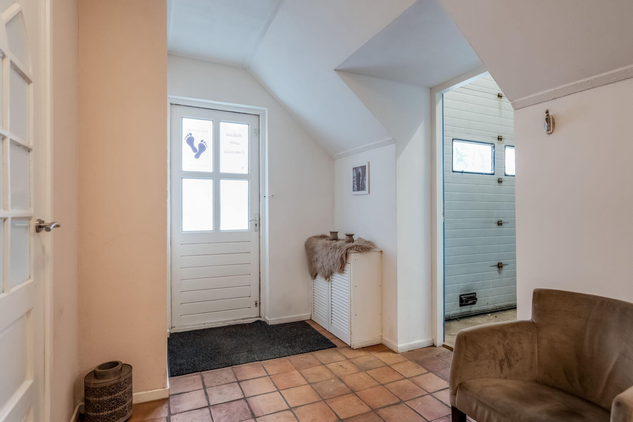 Hal/entree met toegang tot de praktijkruimte, de schuurruimte en de gezellige, ruime woonkeuken, die overgaat in de L-vormige woonkamer met houtkachel. Samen vormen deze ruimtes een oppervlakte van circa 68 m². Via tuindeuren bereikt u de fraaie veranda met uitzicht over de grote, besloten tuin.